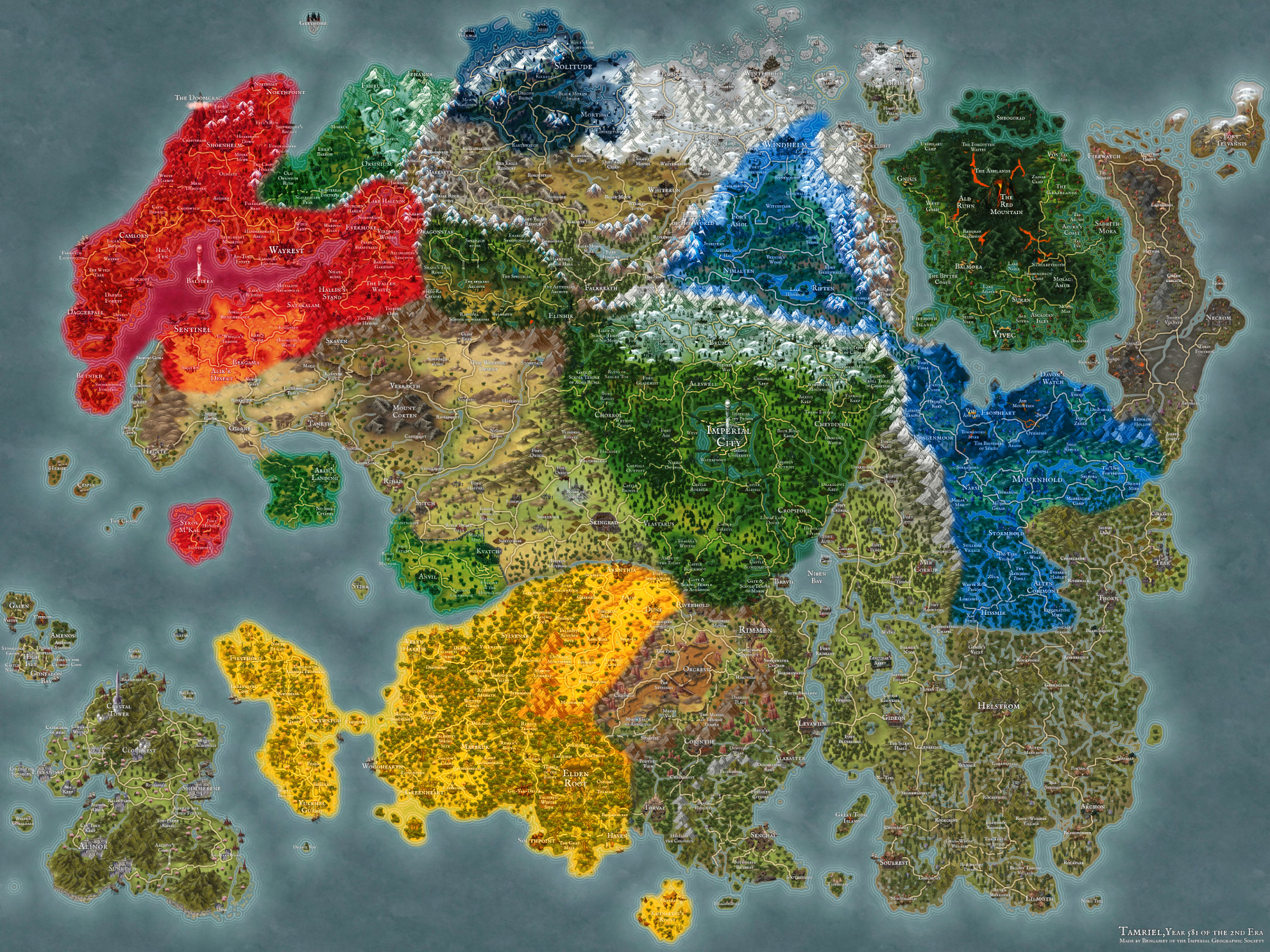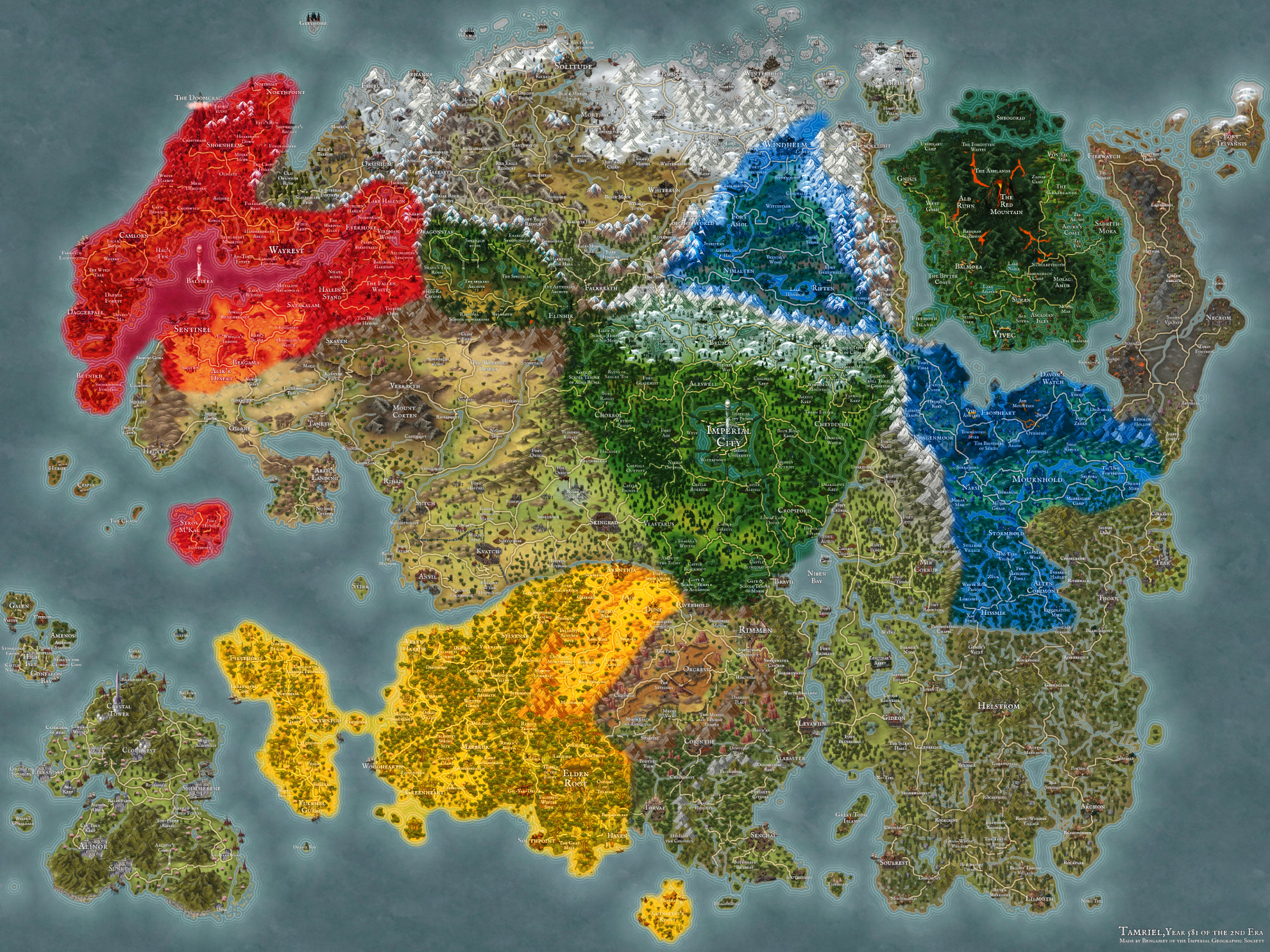 You can use the map below to see which parts of Tamriel are included with the base game today vs. later this year. This map was created by Bengamey and is used with permission. Check out Bengamey’s creations on Reddit!