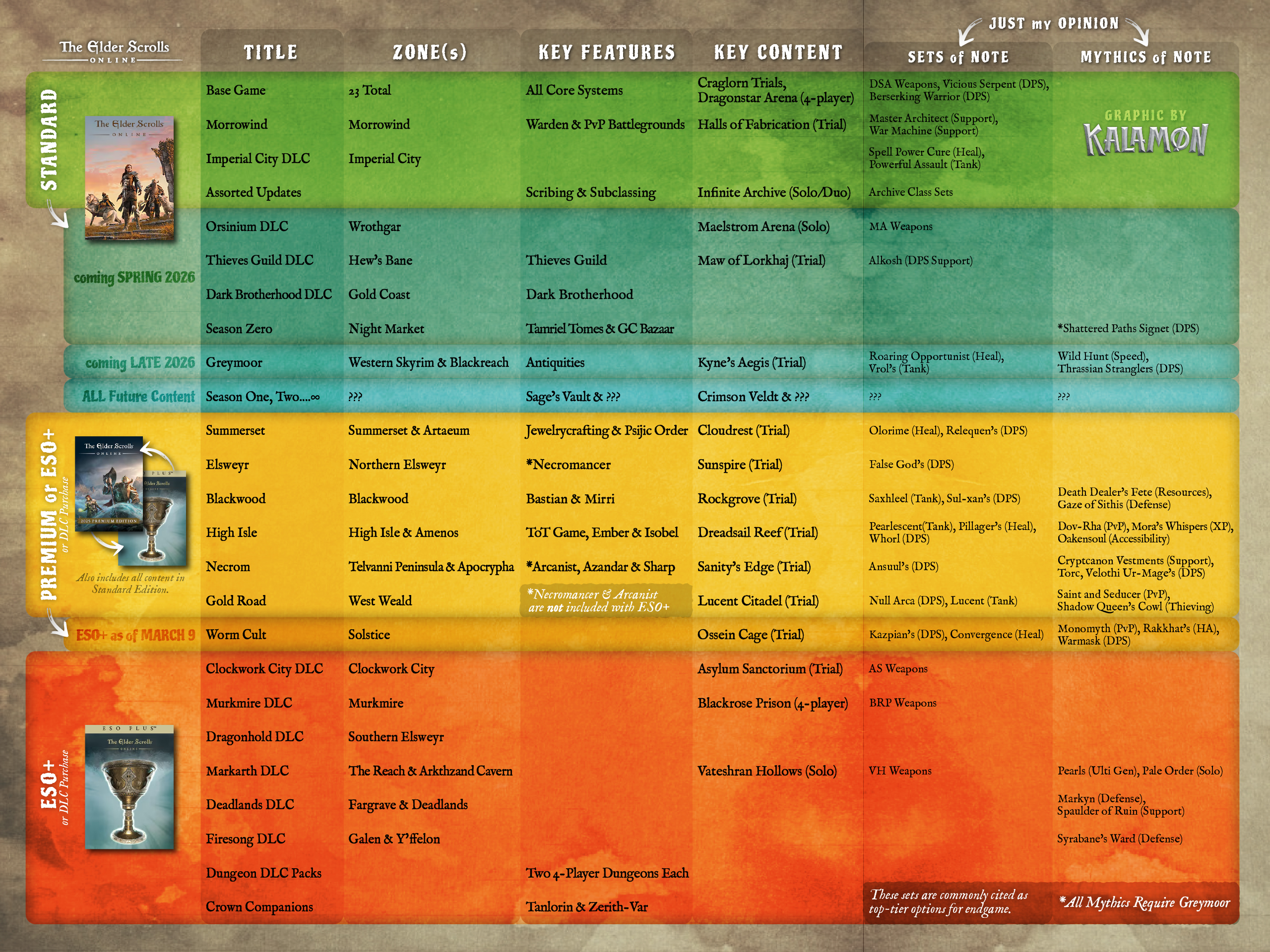 Not every system or Chapter is relevant to every player, but this overview helps illustrate which key features and sets were added in each piece of content. Some may matter more than others depending on how you play. Outside of Greymoor & Summerset, you could probably get by just fine without the rest unless there’s a piece of gear you really want.